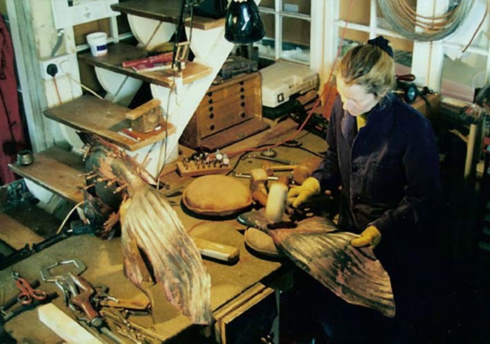 It was in 1991 that I made a copper weather vain, GOLDFISH, as a collaborative sculpture with local blacksmith Daryl Ford. This piece was largely soldered together. The most common way to join thin sheet copper is to solder or braze. About seven years later I embarked on a series of work to explore the use of welded sheet copper to construct sculpture. My idea was to make work on a large scale, in a direct method, which was light and strong enough to ‘fly’, whilst giving the same impression of solidity and form which is found in bronze work. In order to do this I set out to see what would happen if you treated thin copper sheet as if it were bronze - to see if it was possible to weld and ‘dress back’ the metal, and then patinate it in order to hide the welding work. In essence, to make a sculpture in copper so that the viewer would not be distracted by how it was made. This was an entirely new endeavour. I started to anneal and beat sheets of copper into relief panels, and then sought help with the welding from an experienced welder, Adrian Dorney, who was running a course in at Lackham Agricultural college.