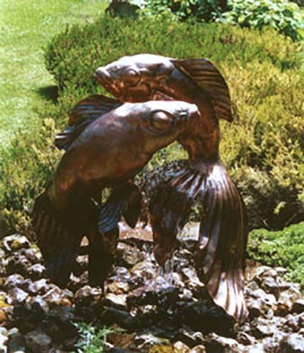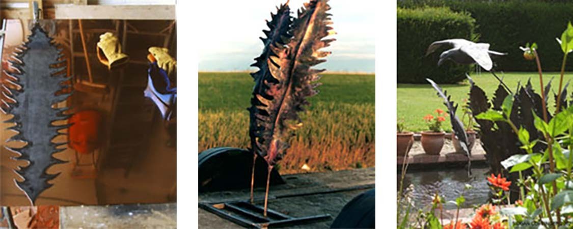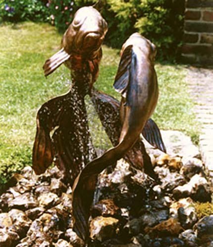 The panels were held in position with the help of a riveted system used for car restoration, and then they were welded together and ‘dressed’ back so the joints become part of the ‘modelled’ surface. The lightness of the material and the thinness of the steel rod means that the gentle movement of the fountain or a passing breeze can cause the fish to sway or ‘dance’.